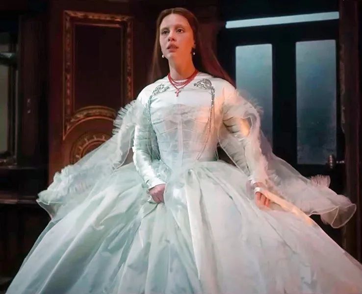 Para as cenas finais, o figurino de Lady Elizabeth atinge um nível de sofisticação surrealista através do uso de véus sobrepostos. Mia Goth é envolta em tecidos de transparência absoluta que possuem aplicações de micro-cristais escurecidos e bordados que imitam cicatrizes keloides em relevo.