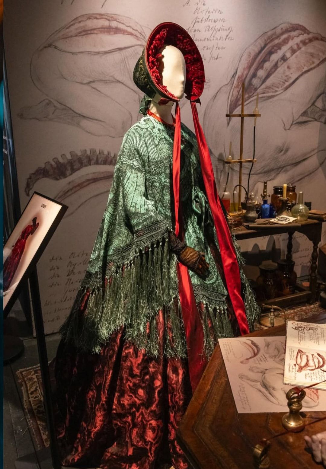 O vestido apresenta uma assimetria proposital, com camadas de tule que parecem se desprender do corpo, simbolizando a instabilidade da vida artificial da personagem. O detalhe mais refinado deste conjunto é o bordado em fios de seda carmesim que percorre o corpete, simulando o sistema circulatório humano e criando uma joalharia têxtil que borra as fronteiras entre a anatomia e a moda.