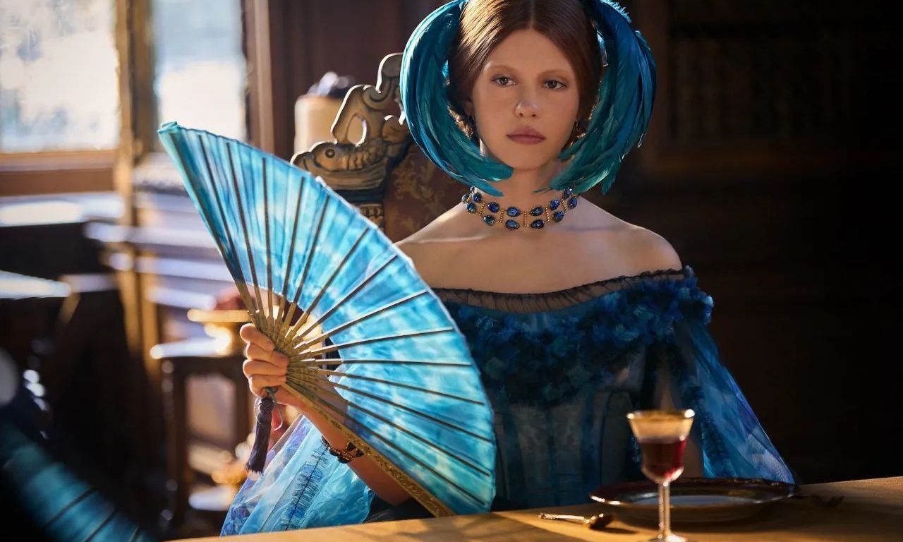 O percurso visual de Lady Elizabeth inicia-se com o rigor da alta sociedade do século XIX. Nos primeiros atos, Mia Goth exibe vestidos de silhueta severa, construídos em veludos de seda em tons de verde-musgo profundo e azul-meia-noite. Estas peças apresentam golas altas adornadas com rendas de bilros e mangas bufantes que comunicam a repressão social e a opulência da linhagem Harlander.