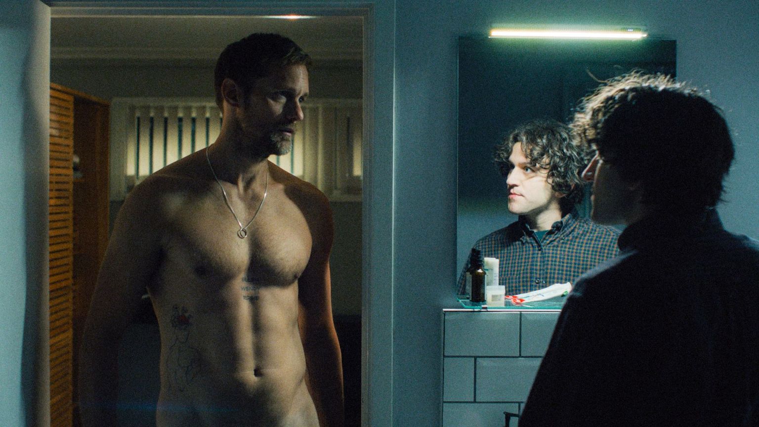 A química entre o elenco principal é o motor da narrativa, com Harry Melling entregando uma performance vulnerável que consolida sua transição definitiva para papéis adultos de grande peso dramático. Já Alexander Skarsgård utiliza sua imponente presença física para construir um personagem que transita entre o magnetismo protetor e uma frieza inflexível, criando um contraste fascinante com a passividade de Colin. Se alguém ainda tinha alguma dúvida sobre o talento do ator, preste atenção na sua última cena. Com seu olhar cheio de emoção, ele transmite exatamente o próximo passo de seu personagem.