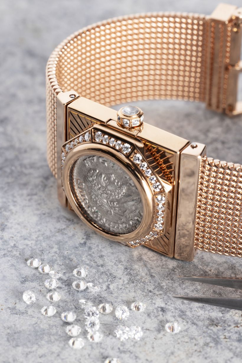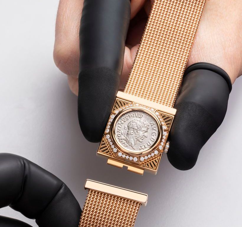 Com este relógio, a Maison expressa seu espírito eclético através de uma combinação de motivos, mesclando o simbolismo de uma moeda antiga, a pureza geométrica do octógono e a delicadeza da textura da malha milanesa.