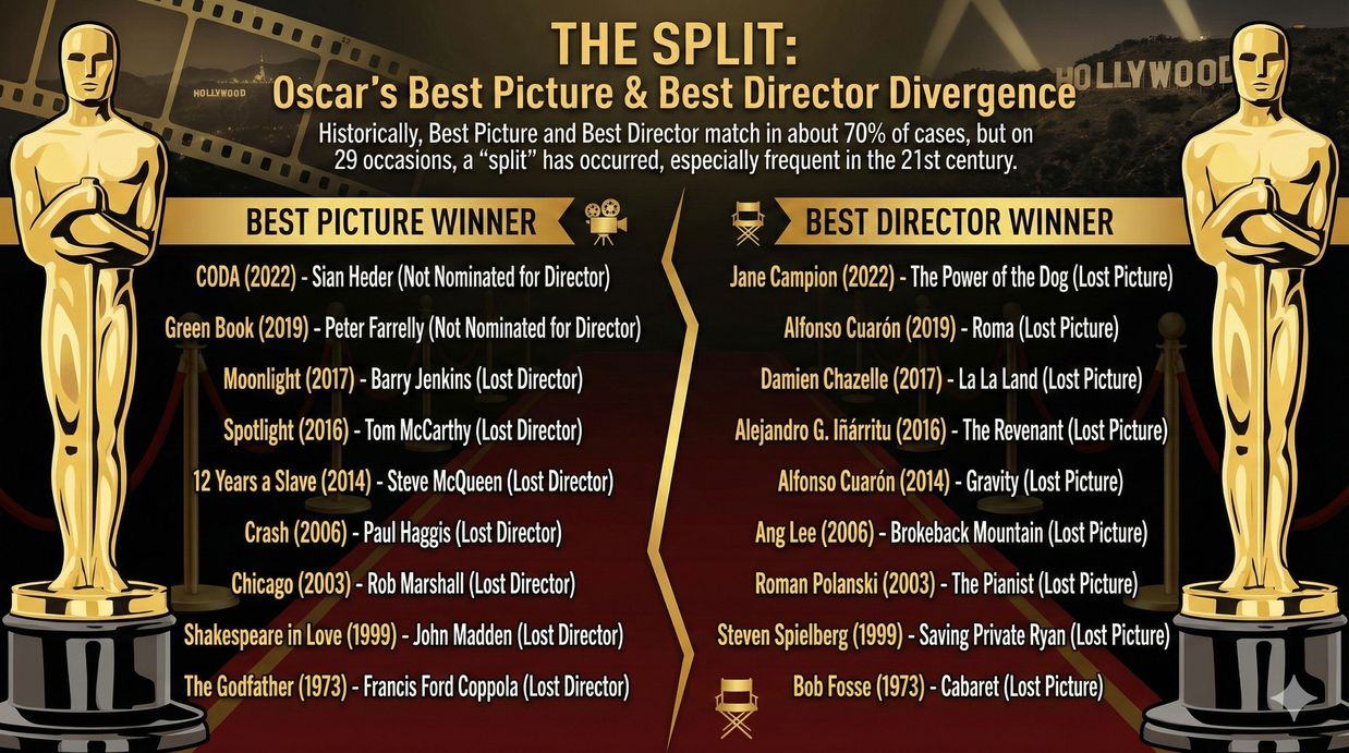 Historicamente, Melhor Filme e Melhor Diretor ocorre em cerca de 70% dos casos, contudo, em 29 ocasiões ao longo de quase um século de tapetes vermelhos, houve uma ruptura sintomática: o filme ganhou, mas o diretor voltou para casa de mãos vazias.