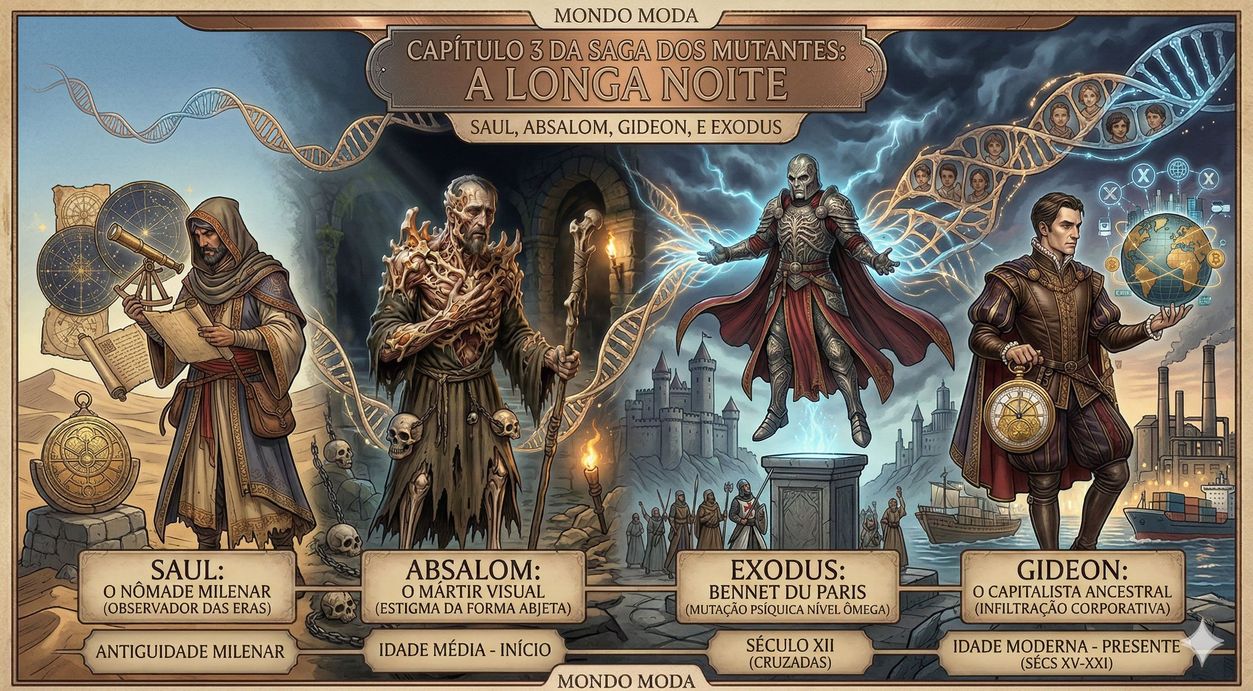 Após o declínio das civilizações mutantes ancestrais, o Gene X não desapareceu; ele se camuflou. Enquanto o mundo atravessava a Idade Média, o Renascimento e a Revolução Industrial, uma elite de mutantes de vida longa operava nas frestas da história oficial. Esta aristocracia da sobrevivência não buscava a integração, mas a permanência através do acúmulo de influência e poder militar. Para esses indivíduos, a mutação não era uma bandeira política, mas uma vantagem evolutiva mantida em segredo sob o risco de perseguições religiosas e fogueiras.
