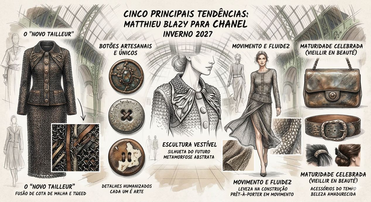 A temporada de Inverno 2027 marcou um verdadeiro ponto de inflexão na moda internacional. As estreias de Matthieu Blazy na Chanel e Jonathan Anderson na Dior não representaram apenas uma dança das cadeiras, mas sim manifestos contundentes sobre o futuro do luxo. Longe da logomania passageira e do desespero por engajamento instantâneo nas telas dos celulares, ambos os designers propuseram um retorno ao intelecto, à construção meticulosa e à valorização do tempo.