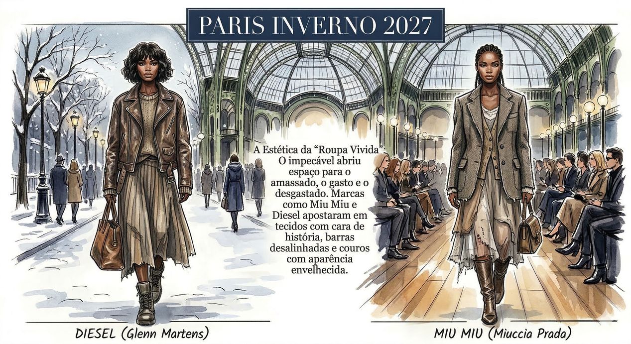 A Estética da “Roupa Vivida”: O impecável abriu espaço para o amassado, o gasto e o desgastado. Marcas como Miu Miu e Diesel apostaram em tecidos com cara de história, barras desalinhadas e couros com aparência envelhecida.