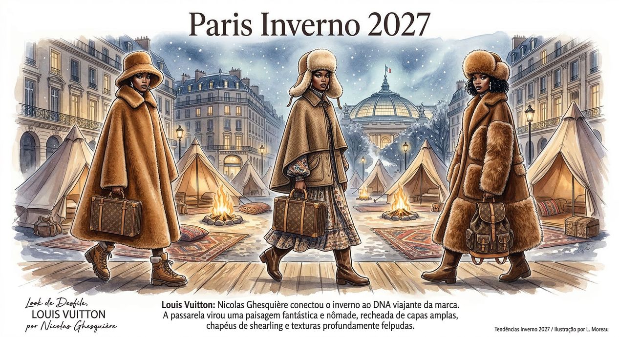 Louis Vuitton: Nicolas Ghesquière conectou o inverno ao DNA viajante da marca. A passarela virou uma paisagem fantástica e nômade, recheada de capas amplas, chapéus de shearling e texturas profundamente felpudas.