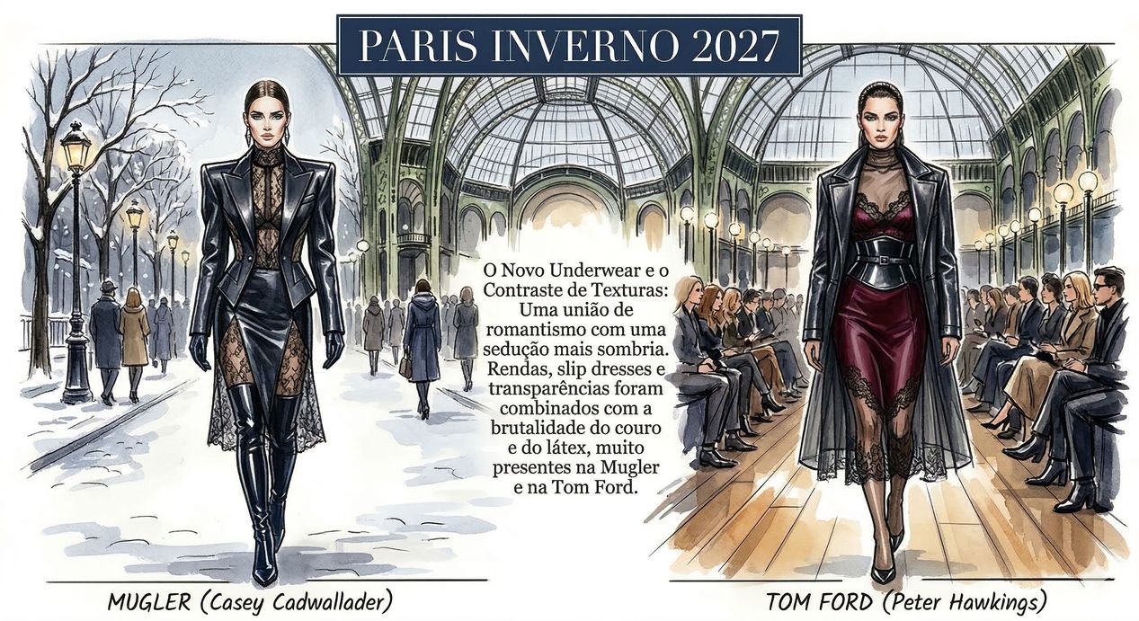 O Novo Underwear e o Contraste de Texturas: Uma união de romantismo com uma sedução mais sombria. Rendas, slip dresses e transparências foram combinados com a brutalidade do couro e do látex, muito presentes na Mugler e na Tom Ford.