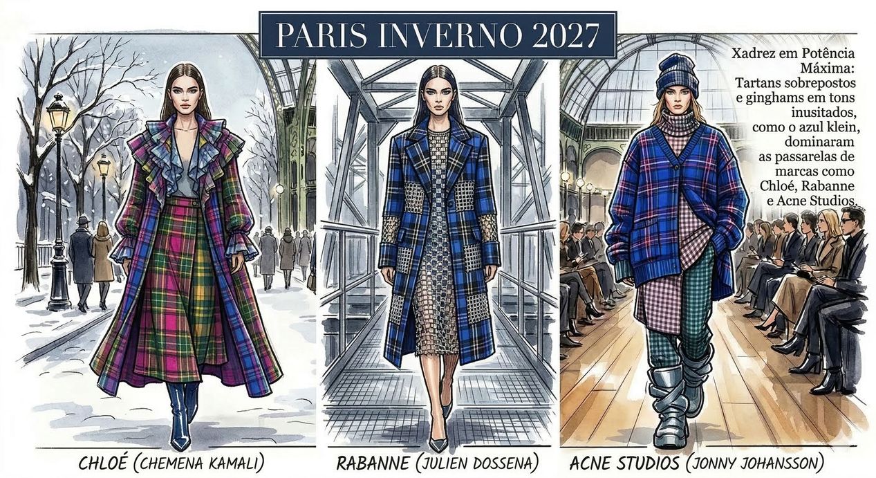 Xadrez em Potência Máxima: Tartans sobrepostos e ginghams em tons inusitados, como o azul klein, dominaram as passarelas de marcas como Chloé, Rabanne e Acne Studios.