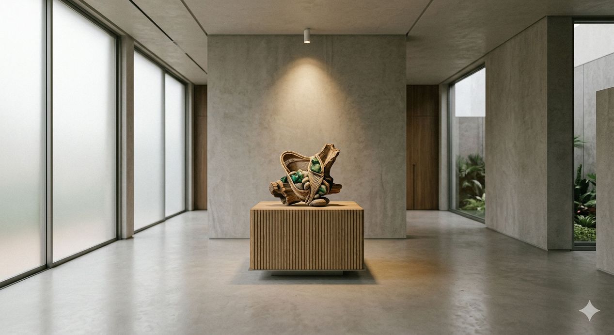 Um ambiente despojado, de arquitetura limpa, luz controlada e bordas refinadas, que abriga um único objeto de forte carga afetiva — seja uma obra de arte transgressora, uma peça artesanal ou uma biojoia ancestral — cria uma tensão poética imediata.