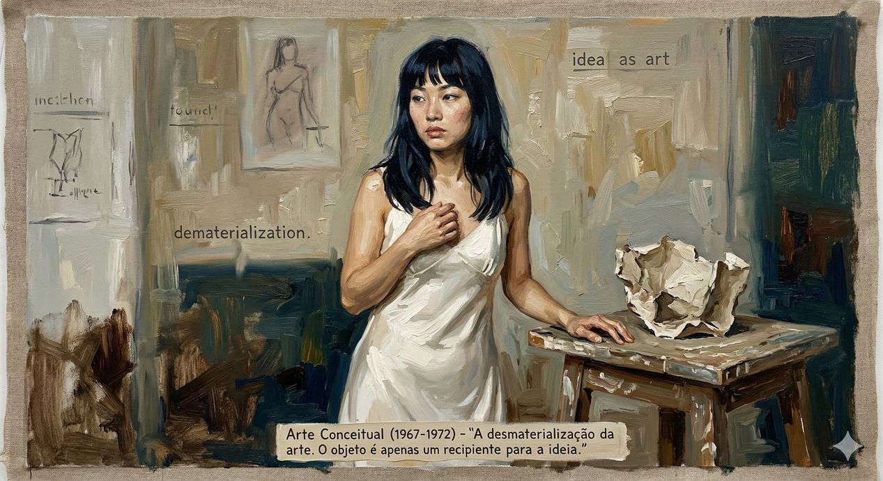 A Proposta: A ideia (o conceito) vale muito mais que a execução física da peça. O objeto é apenas um “recipiente” para a ideia, e pode ser feito por qualquer pessoa — ou até mesmo nem existir. É a “desmaterialização” da arte.