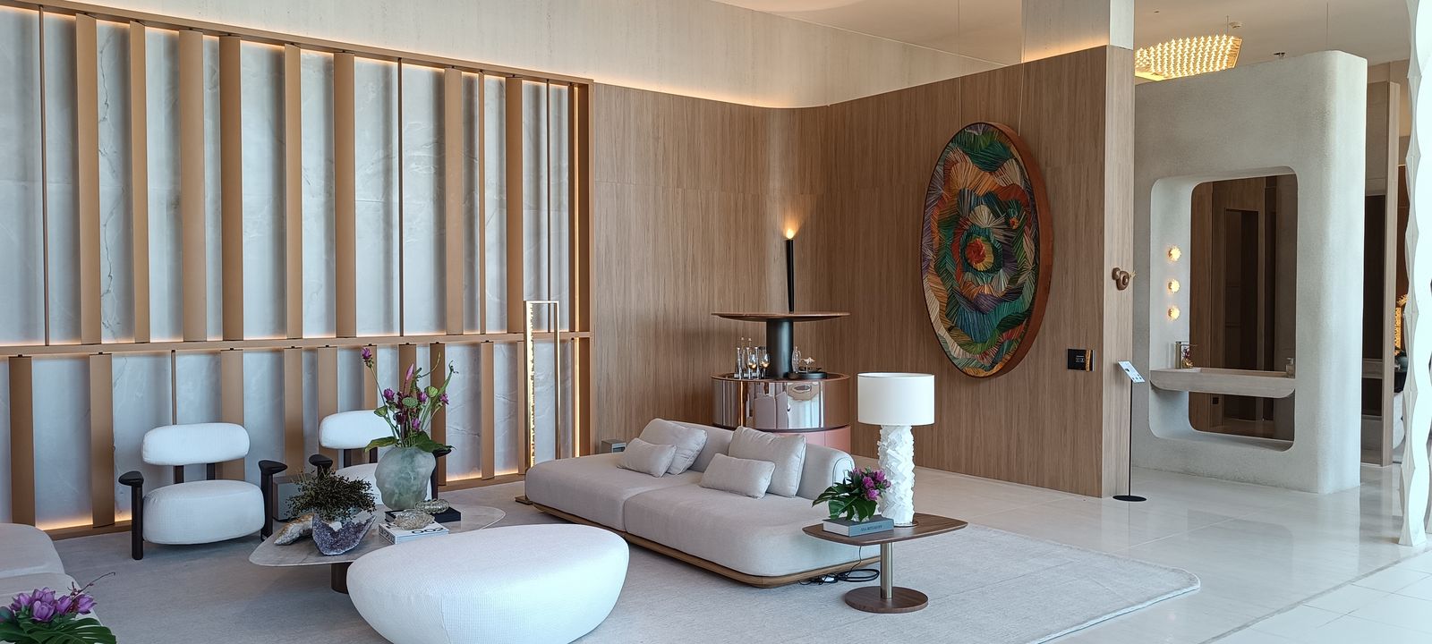 A grande novidade arquitetônica desta edição é o uso dos corredores envidraçados do complexo. A paisagem externa é “sequestrada” para dentro dos espaços, criando uma moldura viva para lofts, suítes, home cinemas e até um ateliê de joias.