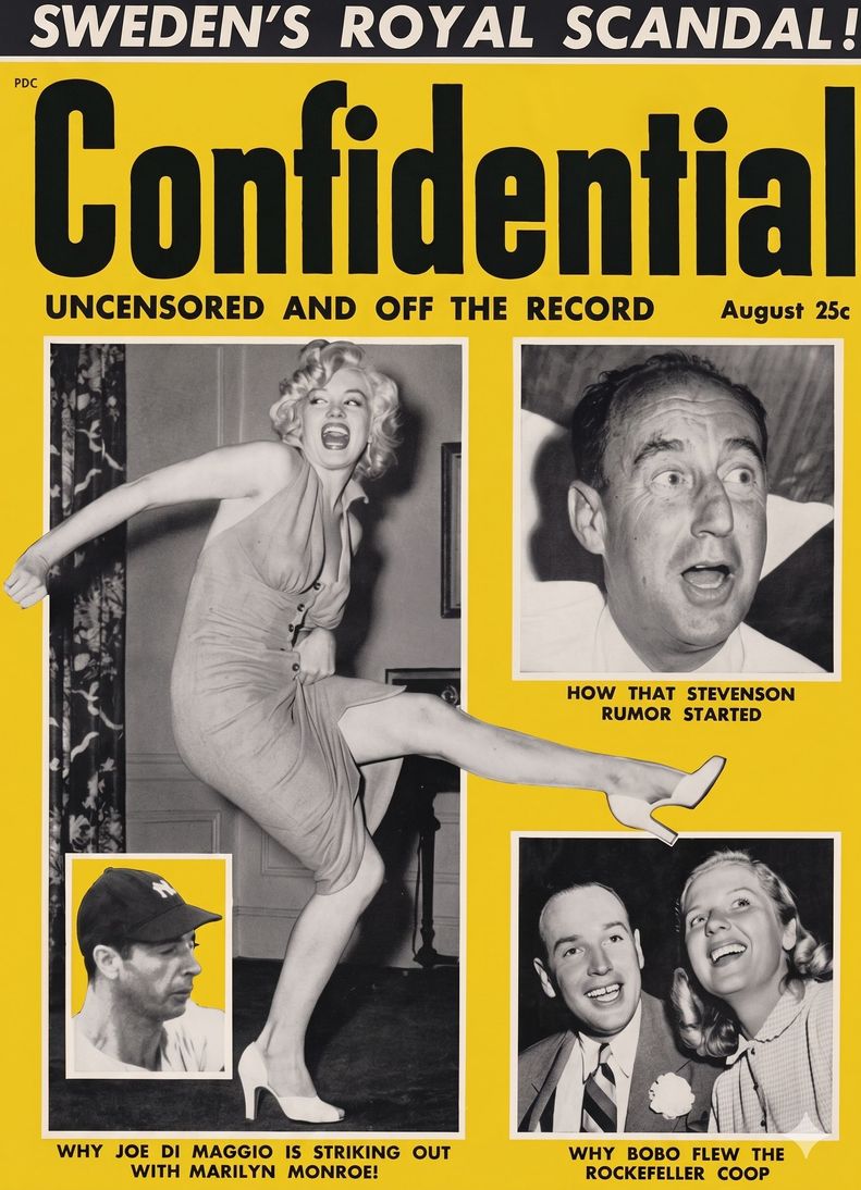 Nascia assim a revista Confidential, com o lema provocativo: “Contando os fatos e dando os nomes”. O design era pensado para o choque visual, com capas em cores agressivas, como amarelo e vermelho, e títulos em letras garrafais. Harrison abandonou completamente as insinuações elegantes de Louella e Hedda. Ele publicava nomes, endereços e os detalhes mais íntimos que conseguia obter.