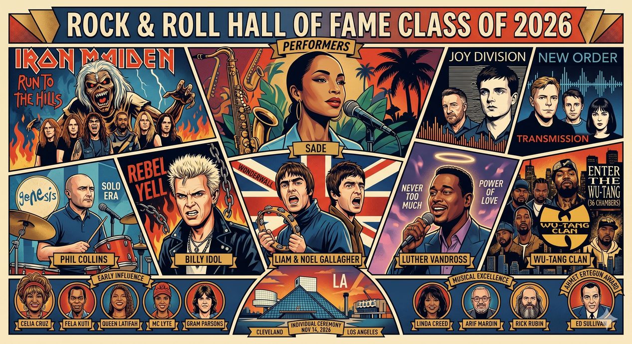 Além de Sade, a lista de “Performers” reflete uma tentativa do Hall de equilibrar o rock clássico com a diversidade sonora. Phil Collins faz história ao entrar como artista solo, juntando-se ao seleto grupo de músicos (como os quatro Beatles e Stevie Nicks) que possuem duas chaves do Hall, já que ele já havia sido induzido pelo Genesis. Ao seu lado, o Oasis finalmente rompe a barreira da resistência, acompanhado pelo ícone punk-pop Billy Idol, a força do metal do Iron Maiden, a melancolia pós-punk de Joy Division/New Order, a voz aveludada de Luther Vandross e a revolução lírica do Wu-Tang Clan.