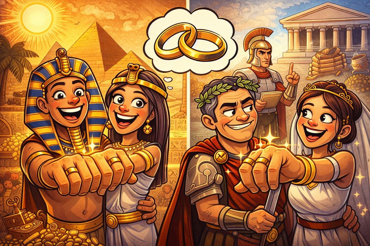 O uso de anéis como símbolo de união remonta ao Egito Antigo, onde o círculo representava a eternidade. Mais tarde, no Império Romano, a tradição ganhou contornos sociais e jurídicos mais definidos. A crença na chamada Vena Amoris — uma suposta veia que ligaria o dedo anelar diretamente ao coração — ajudou a reforçar o simbolismo romântico, embora hoje saibamos que se trata de um mito sem embasamento científico.