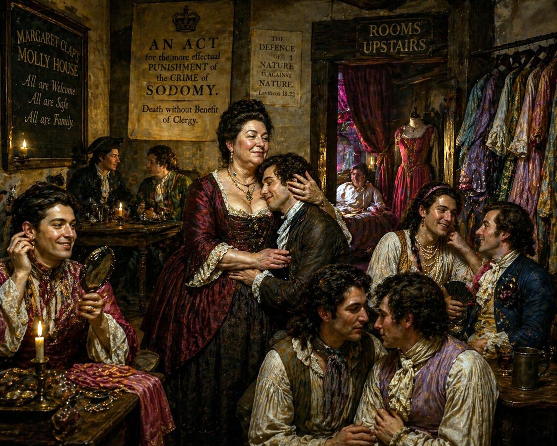Em meados da década de 1720, em uma Londres marcada por legislações que puniam a sodomia com a morte, a taverna de Margaret Clap, em Holborn, emergiu como um espaço singular de resistência. Clap transformou seu estabelecimento em uma Molly House, criando um ambiente que ia muito além do consumo de bebidas: era um refúgio que oferecia camas, figurinos e, sobretudo, a possibilidade de expressão identitária.