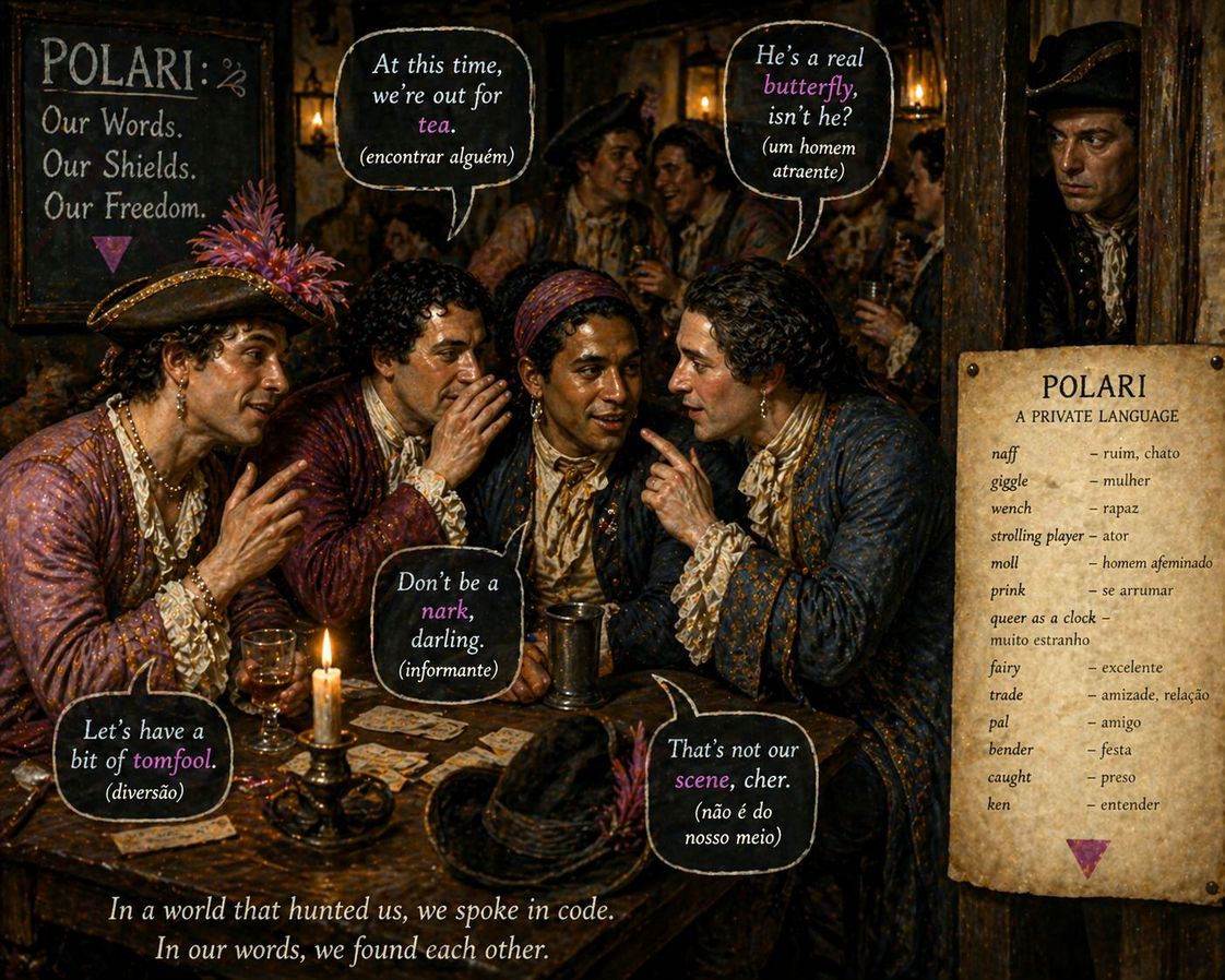 Essa necessidade de criar uma língua própria ecoa até hoje no Brasil através do Pajubá. Assim como os mollies de Londres usavam o Polari, a comunidade queer brasileira desenvolveu um dialeto que funde o português a vocábulos de matriz africana para “aquendar” a realidade e proteger a existência. Onde o Estado impõe o silêncio, a comunidade inventa um novo dicionário.
