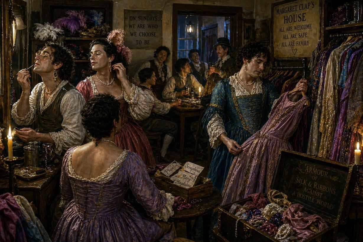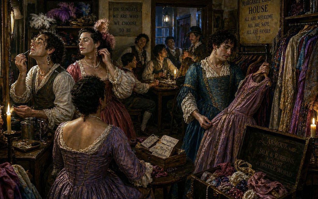 No interior daquela casa, especialmente nas noites de domingo, instaurava-se uma suspensão das normas sociais. Homens de diferentes classes — alfaiates, açougueiros e aprendizes — adotavam nomes como Phoebe, Seraphina ou Mary Magdalene. Esses “nomes de guerra” funcionavam como dispositivos de deslocamento identitário, permitindo uma negociação simbólica com as imposições da vida civil. O acervo de figurinos de Margaret reforçava essa prática, oferecendo vestimentas que operavam como verdadeiras armaduras, viabilizando a performance de gênero em um contexto hostil.